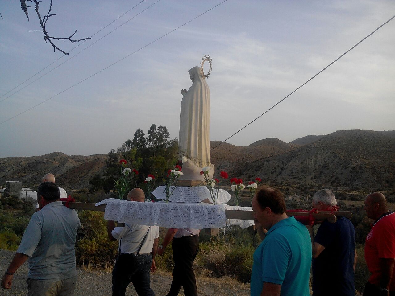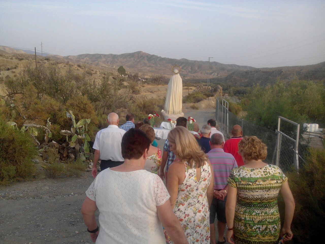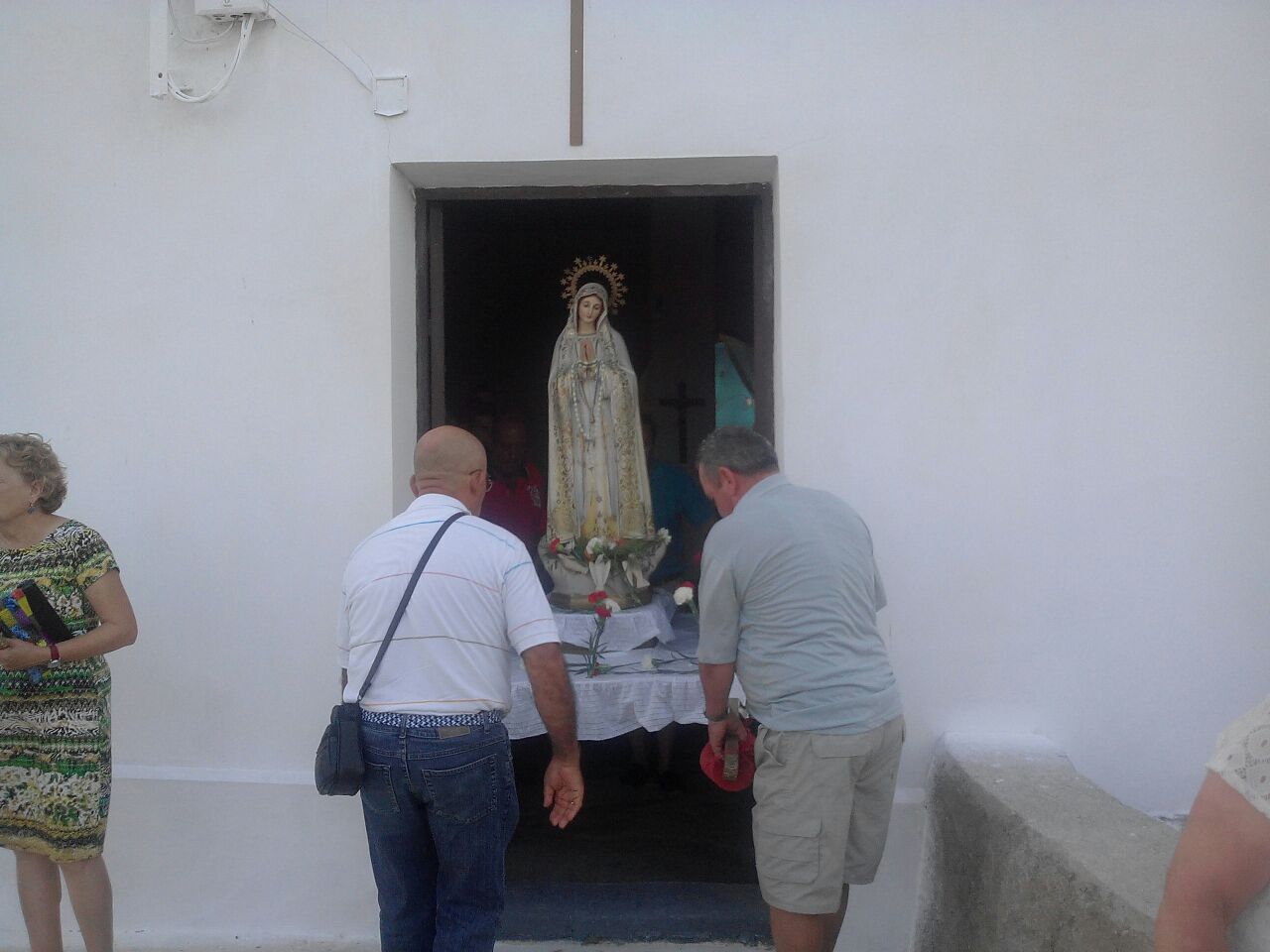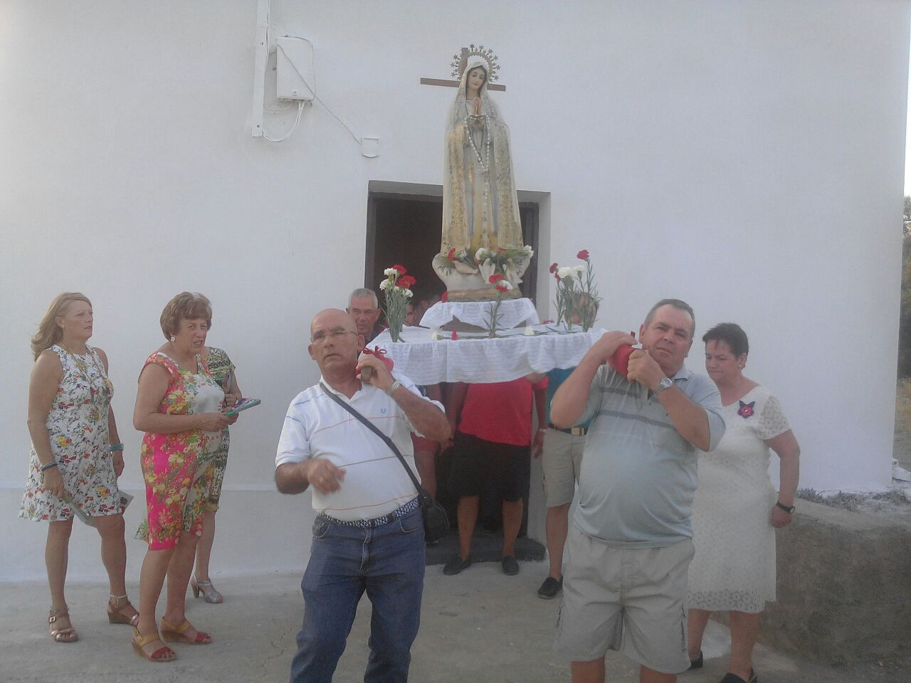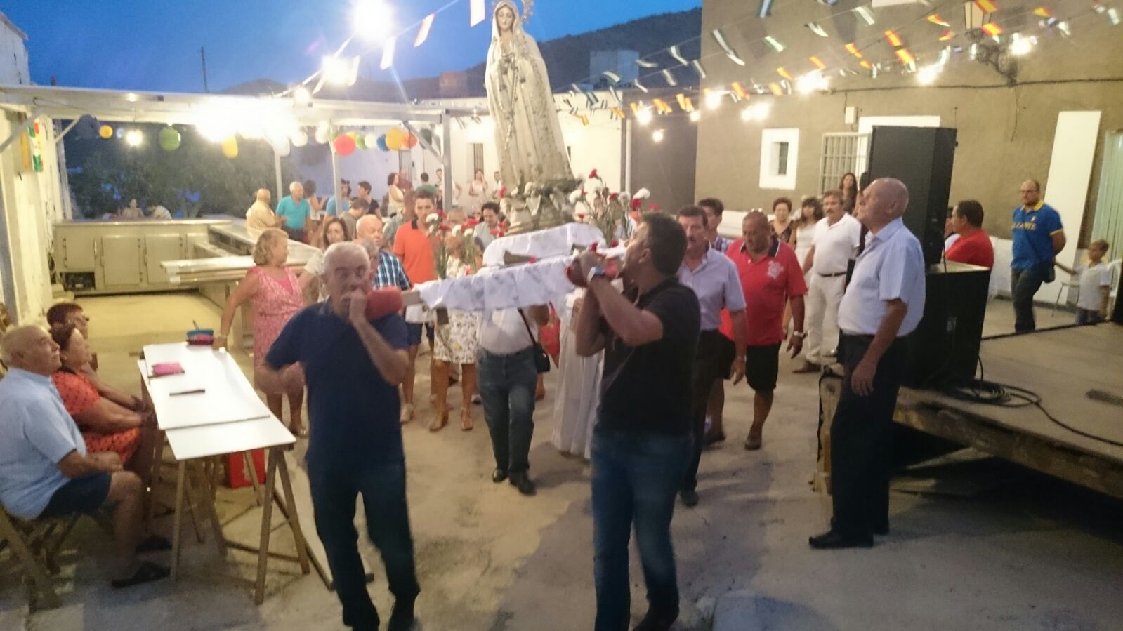 Hacia las 8 de la tarde la virgen de Fátima era engalanada para bajar a la plaza en procesión y celebrar la eucaristía. Una plaza decorada con hermosas flores. Al término comenzó la verbena, acompañados de música en directo pudimos disfrutar de variedad de bocadillos, aperitivos, refrescos, sangría ... Hasta altas horas de la madrugada perduraron los bailes entre copa y copa.