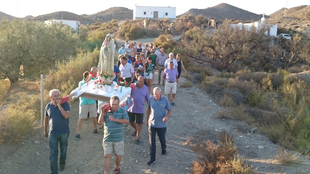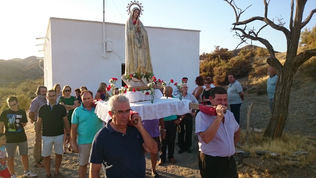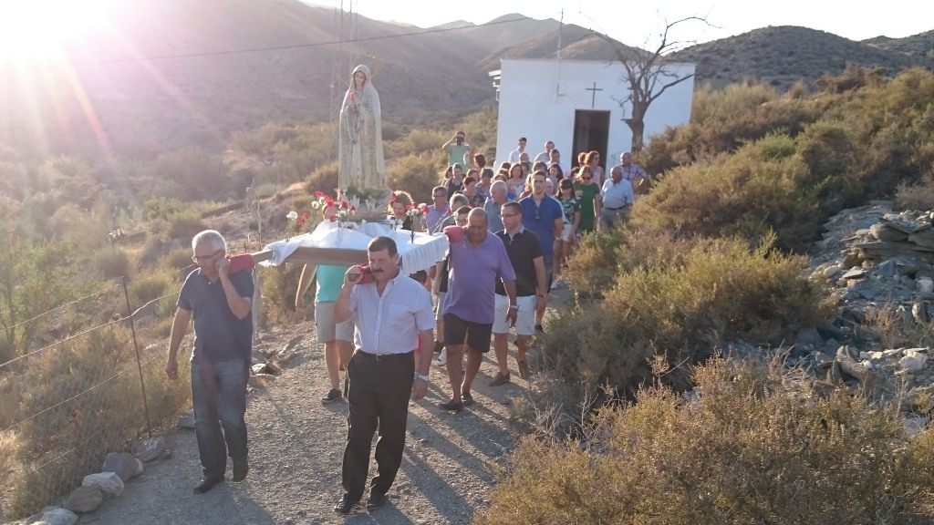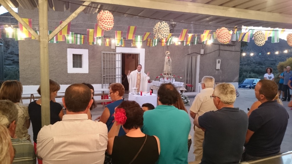 Un precioso y claro atardecer acompañó a la Virgen de Fátima en su habitual descenso desde la Ermita hasta la Cortijada. La misa tuvo lugar más tarde de lo habitual, pudiendo contar con una extraordinaria cantidad de asistentes que no se recordaba desde hacía muchos años. Hubo tiempo también para recordar las recientes pérdidas de seres queridos.