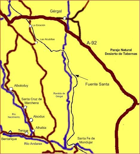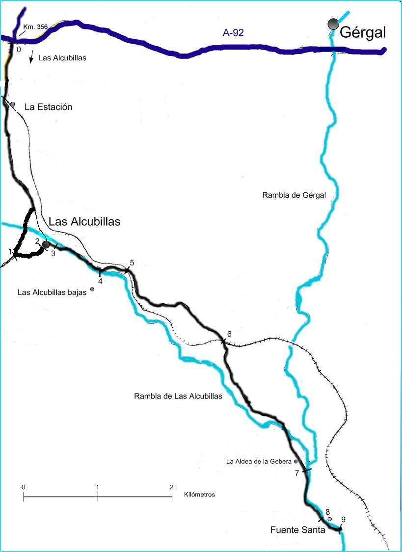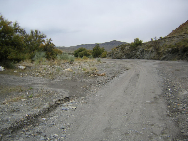 Punto 7 (kilómetro 9,630): En este punto finaliza el camino no asfaltado y se entra en la Rambla de Gérgal. Conviene indicar que antes de llegar a este punto habremos cruzado la Rambla de las Alcubillas y pasado por La Aldea de la Gebera.